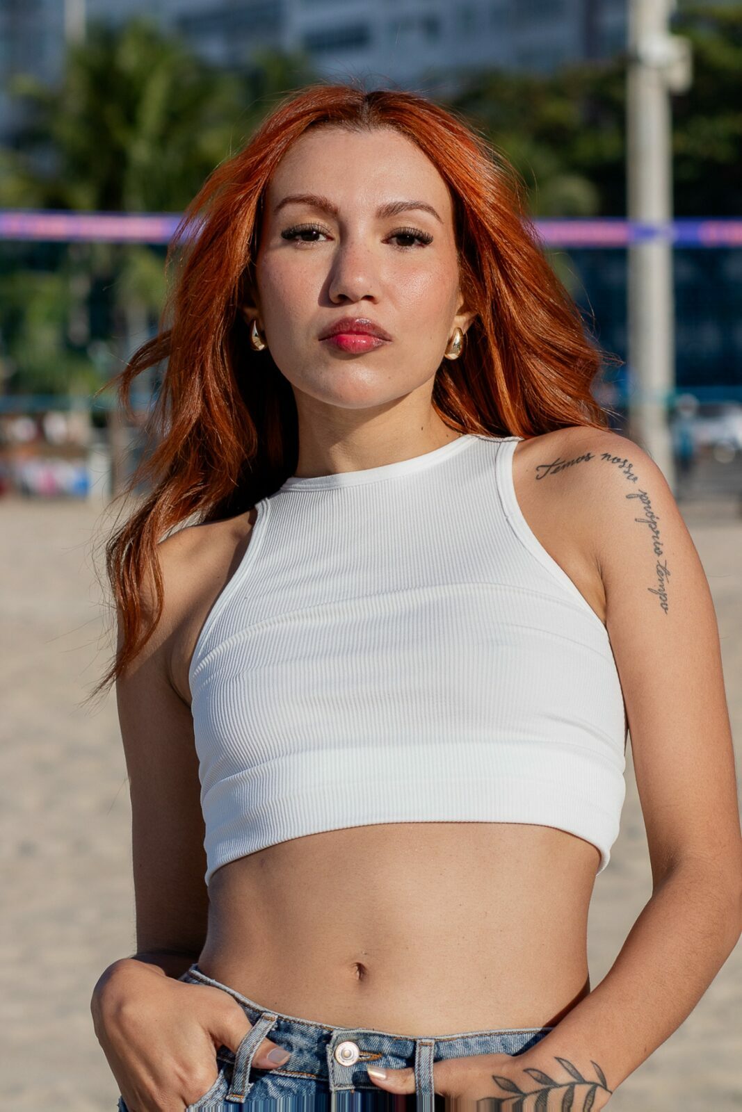 Sessão de fotos na praia do Leme, Rio de Janeiro. Ensaio ao ar livre com luz natural, direção de poses e foco na leveza, elegância e expressão individual.